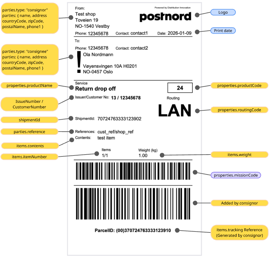 NOTE! The response for Helthjem and Mypack Collect differs when it comes to transport information. Also, when a Mypack Collect is booked, there will also be information about the servicepoint (pick up point) in the response that also must be placed on the label